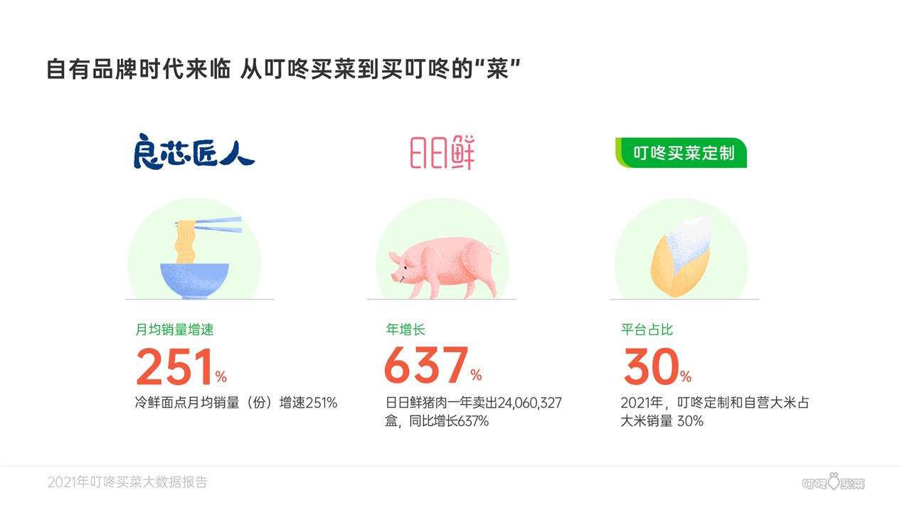 報告還展示了其針對細分賽道布局的“良芯匠人”冷鮮面點、“日日鮮”系列豬肉、“叮咚定制”的大米,都在一年中取得了快速增長。