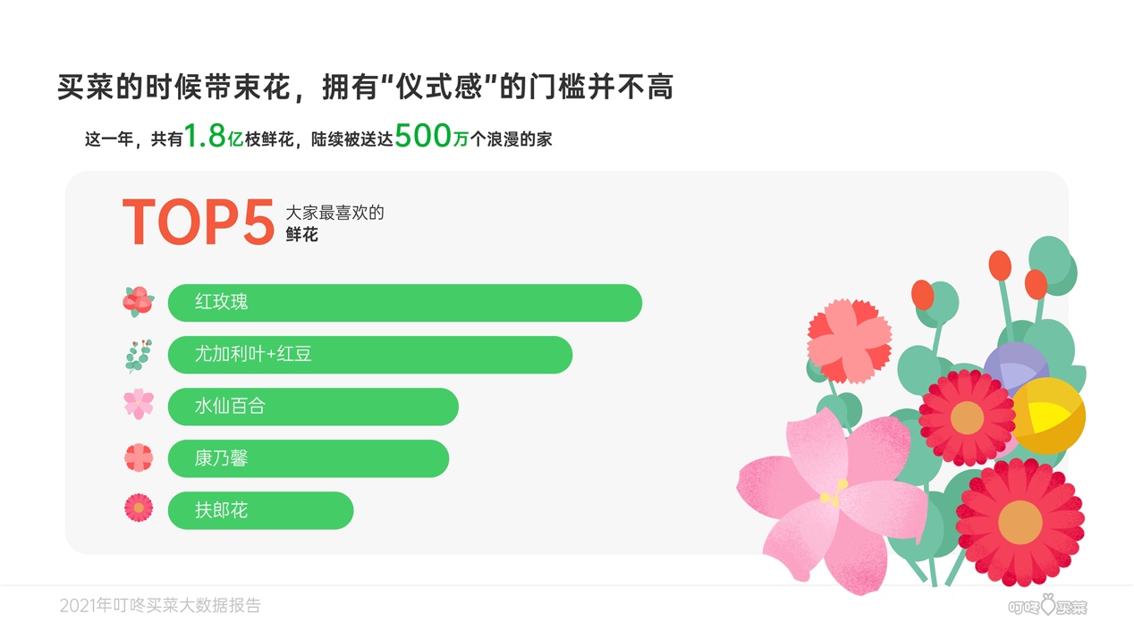 此外,鮮花作為叮咚買菜去年重點發展的業務,也已經獲得了大批用戶的認可。報告顯示,今年一年,叮咚買菜共計送出超過1.8億枝鮮花到500萬個家庭。其中,浪漫的“紅玫瑰”,與更加親民的“尤加利葉+紅豆”“水仙百合(多頭)”、“活力橙光康乃馨混搭小花束”“扶郎花”成為用戶最喜愛的Top 5的鮮花品類。