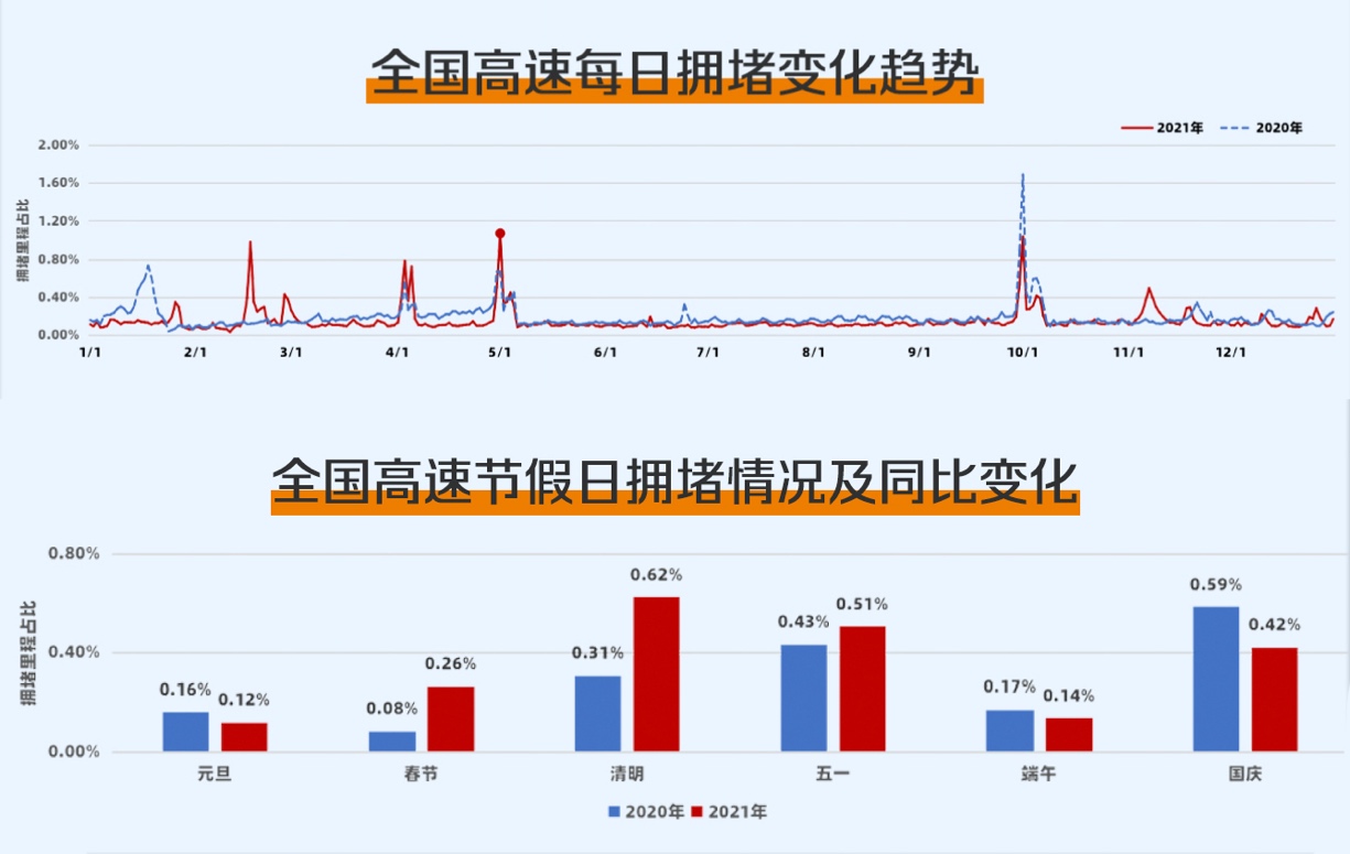 從全年的各節假日來看,同比2020年,2021年春節、清明、五一假期高速擁堵均同比上升,但元旦、端午、國慶假期的高速擁堵則同比下降。
