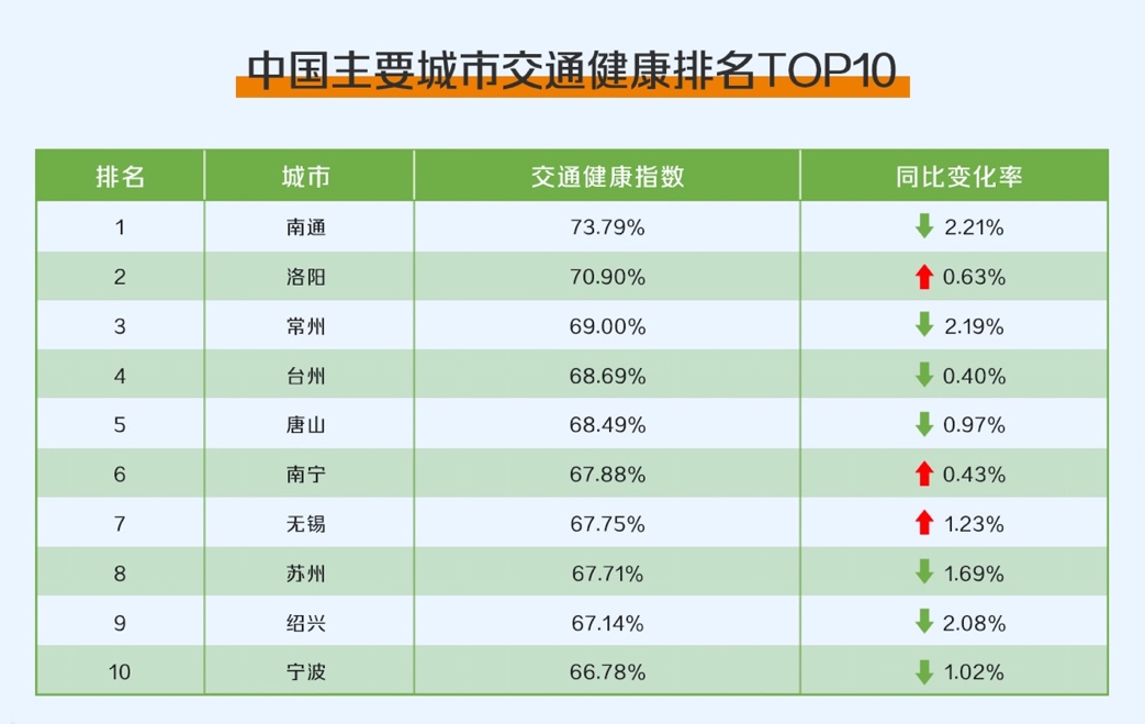 數據顯示:交通健康榜TOP10城市中長三角區域占七席,其中南通交通健康程度最高,其交通健康指數為73.79%,其次是洛陽、常州、臺州、唐山、南寧、無錫、蘇州、紹興、寧波。