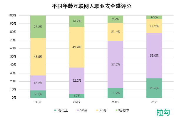 從年齡來看,72.8%的80后缺乏職業安全感,其中“極度缺乏沒安全感,焦慮情緒已影響生活”的占比高達27.2%。而95后心態相對穩健,78.6%的95后具備6分以上的職業安全感。在互聯網這個“年輕”的行業中,“年齡焦慮”始終未被解決?!皩?0后來說,絕大部分已經觸摸到了職場的天花板,除了自身的家庭壓力,還面臨企業年輕血液流入更換的壓力”,拉勾招聘數據研究院專家解釋稱,“相對來說,95后更具備年齡優勢,家庭壓力較小,進入職場時間短,對薪酬的預期相對較低,因而心態更穩”。
