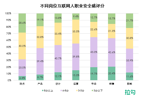 與普遍認知不同的是,互聯網行業的“金飯碗”技術人才心態面臨危機——28.6%的技術從業者十分缺乏安全感,僅31.4%覺得安全。相反,作為行業通用職位的市場人才心態更為積極,64.7%具備安全感。業內人士認為,這是源于該職位的通用性,“即便行業受到較大波動,這些通用職位的人才也可以跨界進入其他行業,而技術人才則有明顯的界限?!?/p>