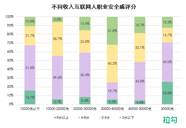 從收入結構來看,處于6分以下的安全感缺失人群基本集中于中高收入人群。其中,月薪3萬元到4萬元的人才,僅有25%相對有安全感,是不安全感覆蓋范圍最大的群體。而月薪5萬元以上的高級人才,七成極具安全感,經濟基礎不僅決定上層建筑,還決定著職業心態。
