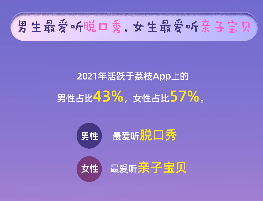 在過(guò)去的2021年,活躍于荔枝App上的男性占比43%,女性占比57%。從內(nèi)容喜好來(lái)看,男生最?lèi)?ài)聽(tīng)脫口秀,女生最?lèi)?ài)聽(tīng)親子寶貝。