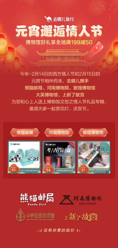 在中國傳統節日元宵節,《上新了·故宮》的尋香紫禁城香水禮盒、敦煌博物館的飛天胡旋手指滑板、河南博物院的網紅考古盲盒等近百個文創產品都能在去哪兒旅行APP上享受節日特惠。