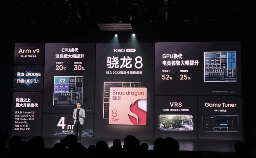 K50 電競版搭載全新一代驍龍8 旗艦處理器,采用最新一代 4nm 芯片工藝,CPU、GPU、AI、ISP 等全部換代,幾乎是高通史上最大幅度的一次升級。其中,與游戲性能緊密相關的 GPU 部分,相比上代驍龍888,提升幅度高達 52%。搭配滿血版 LPDDR5 內存和升級版 UFS 3.1 高速閃存,讓極致性能充分釋放。