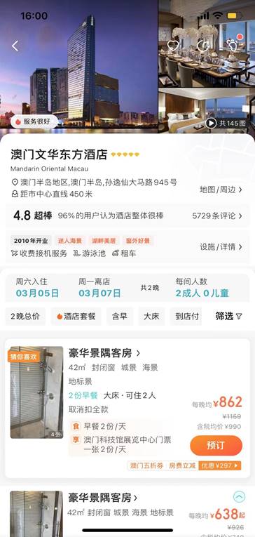 在境外游依然受限的背景下,澳門憑借高性價(jià)比的機(jī)酒+穩(wěn)定的疫情防控,逆勢(shì)翻盤。來自去哪兒的大數(shù)據(jù)顯示,2021年全年,澳門五星級(jí)酒店均價(jià)要比北上廣深五星級(jí)酒店均價(jià)便宜40%左右,澳門酒店預(yù)訂量比2020年增長一倍;2022年春節(jié)期間赴澳門的機(jī)票量,較2021年春節(jié)增長兩倍。疊加優(yōu)惠券后,部分澳門五星酒店對(duì)比內(nèi)地同品牌酒店,要便宜50%以上。