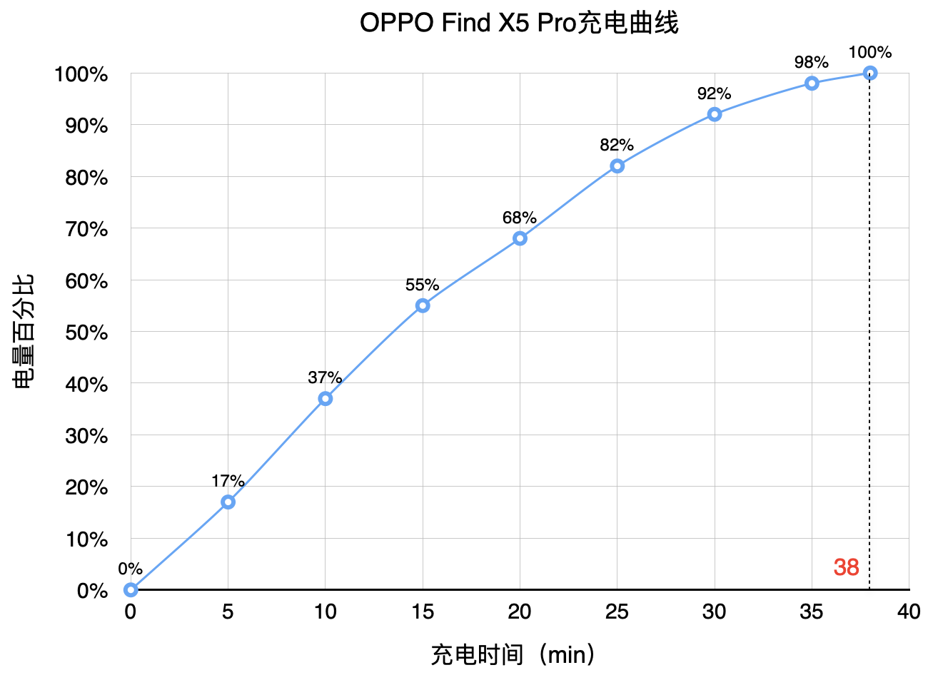 續航方面,Find X5 Pro內置了5000mAh的雙電芯大容量電池,并升級到了最高80W的SuperVOOC有線閃充,此外還搭配最高50W的AirVOOC無線充電技術。實測使用原裝充電器材為Find X5 Pro進行有線充電,0-100%充電僅需耗時38分鐘。