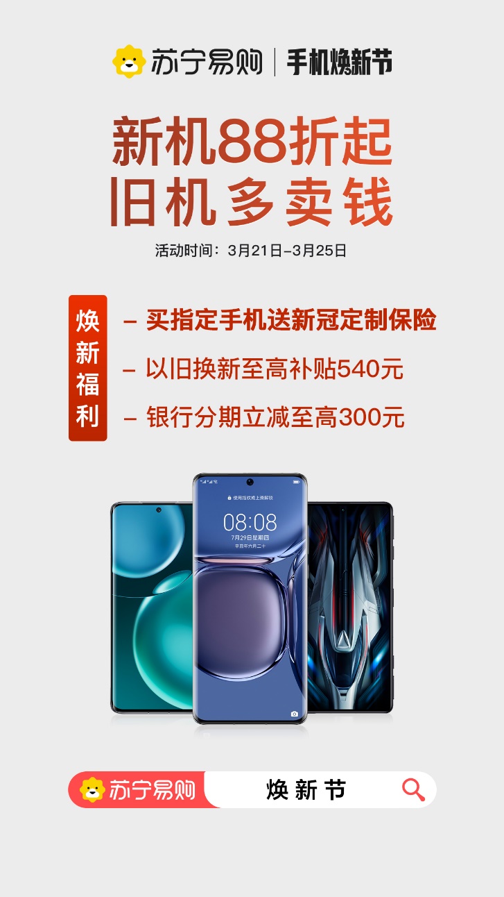 各大品牌新品亮相,激活了手機市場的換新需求,蘇寧易購此次重磅啟動手機煥新節,重點通過線上線下全場景的以舊換新服務優勢,一站式解決消費者換新需求,多款新機在此次手機煥新節活動中享受補貼優惠。