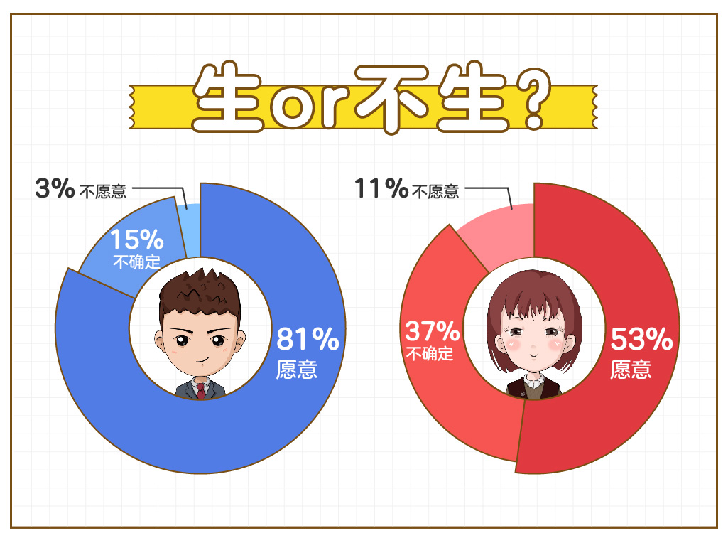 正如《報告》所示,71%的女性將生育時間放在婚后的1-3年,但愿意生育孩子的女性僅有53%,還有37%處于猶豫不定的狀態(tài)。