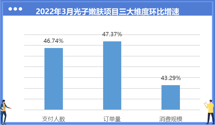 實際上,光子嫩膚因為見效快、痛感小、無需恢復(fù)等優(yōu)勢,具有頗高的復(fù)購率,也正是因為這些優(yōu)點,使得光子嫩膚成為越來越多消費者踏入醫(yī)美領(lǐng)域的入門項目。與2022年2月相比,光子嫩膚在3月的支付人數(shù)環(huán)比增長了46.74%,訂單量環(huán)比增長47.37%。