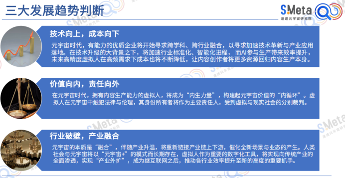 在《報告》中,速途元宇宙研究院針對虛擬人提出了三大預判:技術向上,成本向下、價值向內,責任向外、行業破壁,產業融合。