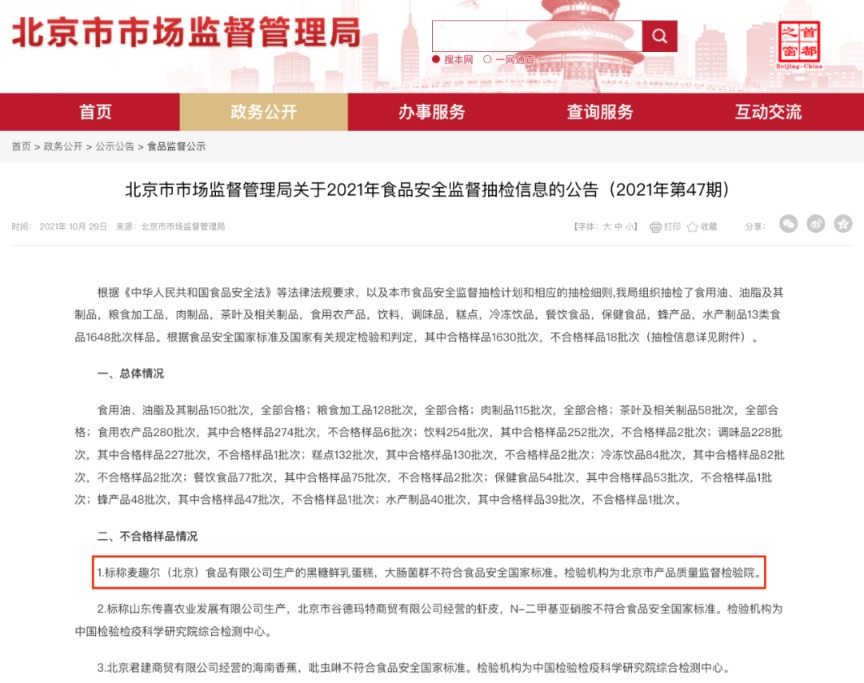 據速途網了解,去年麥趣爾生產的黑糖鮮乳蛋糕也被檢出不合格。2021年10月29日,北京市市場監督管理局發布關于2021年食品安全監督抽檢信息的公告(2021年第47期),其中,標稱麥趣爾(北京)食品有限公司生產的黑糖鮮乳蛋糕(120克/盒、20210419),大腸菌群不符合食品安全國家標準。檢驗機構為北京市產品質量監督檢驗院。