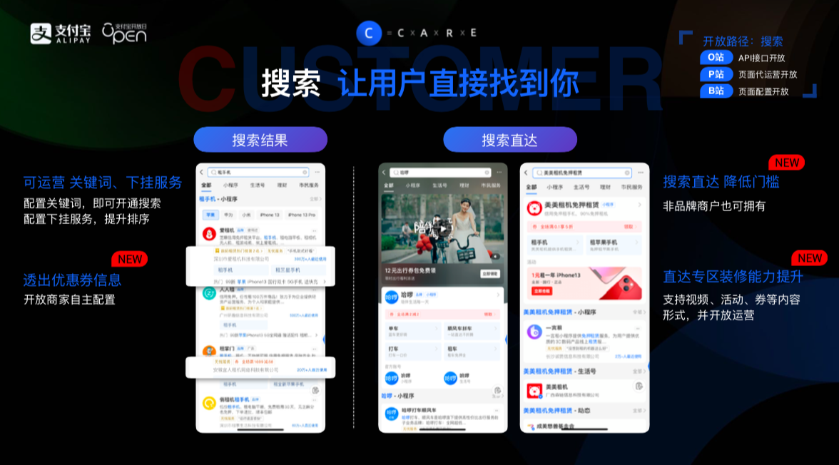 速途網7月21日消息(報道:李楠)今日,支付寶在2022合作伙伴大會上公布了搜索產品的最新升級:開放搜索“小程序直達”,降低商家準入門檻;優化服務搜索結果頁展示,增加優惠券透出,助力提升點擊轉化。據悉,過去一年,通過支付寶“搜索”進入小程序的用戶量同比增長87%,搜索已成為支付寶用戶訪問小程序的重要入口。