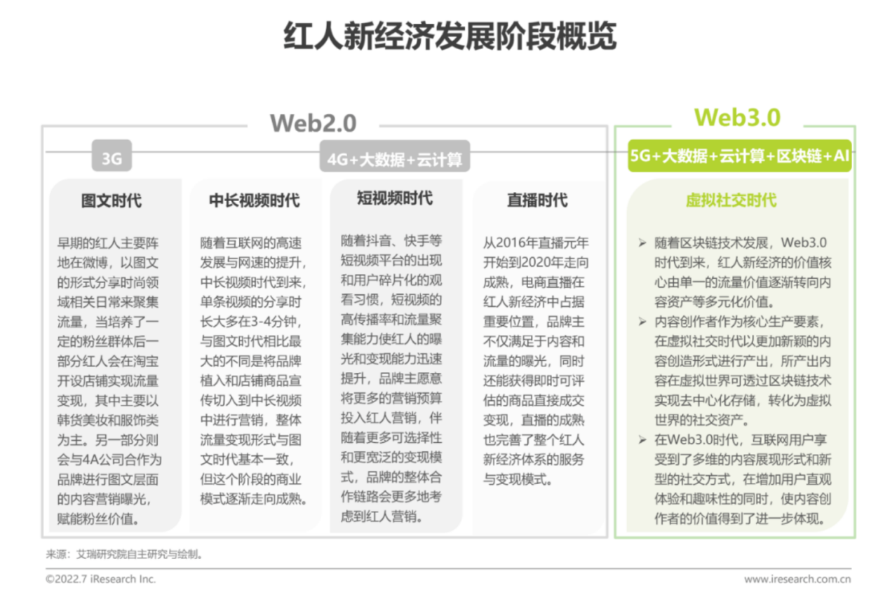 7月25日,艾媒咨詢聯(lián)合紅人新經(jīng)濟(jì)企業(yè)天下秀發(fā)布了《2022年中國紅人新經(jīng)濟(jì)行業(yè)發(fā)展報告》。報告指出,以紅人新經(jīng)濟(jì)為基礎(chǔ)開展的商業(yè)形式日漸豐富,預(yù)計2024年紅人新經(jīng)濟(jì)關(guān)聯(lián)的產(chǎn)業(yè)市場規(guī)模有望突破七萬億。而在Web3.0時代下,元宇宙等新興科技概念的入局為紅人新經(jīng)濟(jì)帶來新的升級。