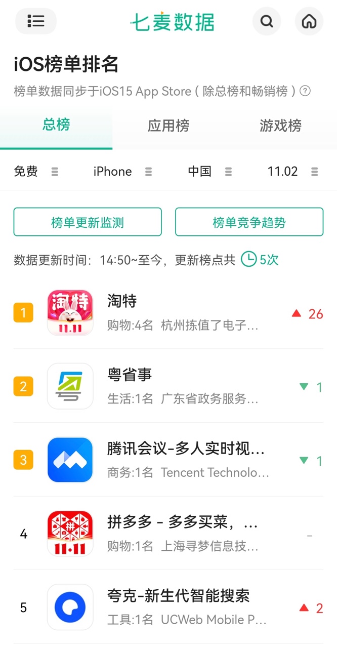今年雙十一,性價比消費活力強勁。記者在多個第三方數據機構榜單看到,11月2日淘特重回蘋果App Store應用榜單排名第一。