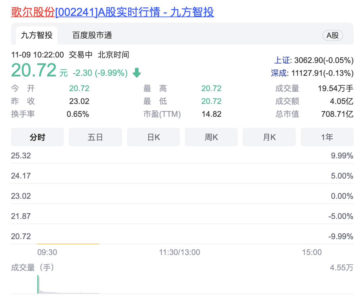 速途元宇宙研究院11月9日訊 今日早間,歌爾股份開盤即跌停,截至發稿每股股價為20.72元,Wind數據顯示,歌爾股份開盤時跌停板上的封單為164.9萬手。