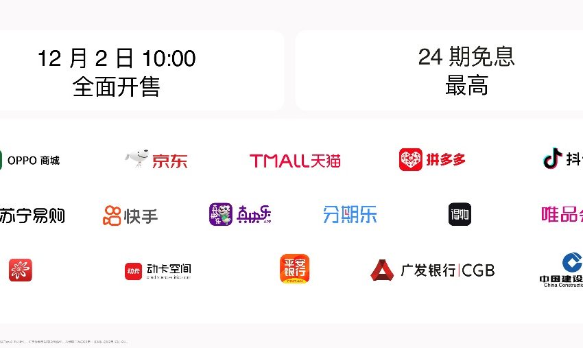新品即日起接受預定,并將于12月2日上午10點在OPPO商城以及京東、天貓、蘇寧、抖音等線上渠道全面開售,首銷期間可享受最高24期免息。同時,OPPO體驗店、三大運營商合作廳、蘇寧、國美、迪信通、順電等線下賣場將同步開售,首銷期間可享受最高12期免息。12月11日前,在線下購買的用戶可獲得最高1300元以舊換新補貼,購買1年碎屏保將額外贈送一年有效期。此外,即日起至2022年12月4日,預訂Reno9系列16GB+512GB版本的用戶,將有機會參與大內存免單計劃。