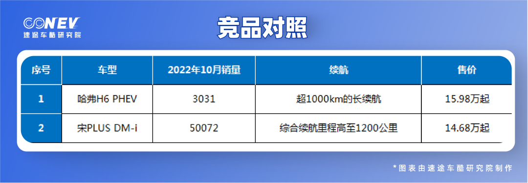以重磅推出的哈弗H6 PHEV為例,該車與宋PLUS DM-i在售價、純電續航里程等相仿,是直接競爭對手。