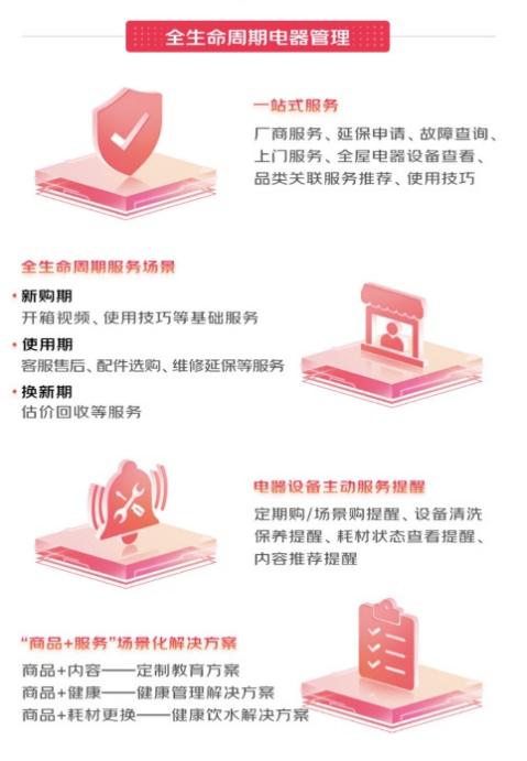 除打通產(chǎn)品壁壘外,能夠洞察用戶個性化需求、滿足多元化場景服務也是京東小家的一大優(yōu)勢。依托智能與服務,京東小家為用戶提供家電家居產(chǎn)品新購-使用-回收換新全生命周期服務。同時,京東小家還可以扮演智能管家的角色,為消費者提供電器設(shè)備主動服務提醒功能,如凈水器、電動牙刷、空氣凈化器等設(shè)備的耗材更換主動提醒、質(zhì)保助手日期主動提醒等;對于有特定需求的消費者,京東小家還推出了“商品+服務”場景化解決方案,整合京東供應鏈優(yōu)勢,推出定制教育方案、健康管理方案等。