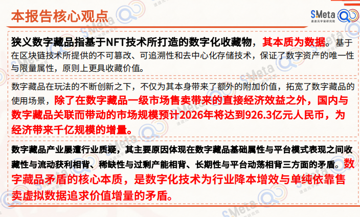 數字藏品在玩法的不斷創新之下,不僅為其本身帶來了額外的附加價值,還拓寬了數字藏品的使用場景。速途元宇宙研究院在《激活數字經濟的鑰匙—2022數字藏品產業研究報告》中預計,除了在數字藏品一級市場售賣帶來的直接經濟效益之外,國內與數字藏品關聯而帶動的市場規模2026年將達到926.3億元人民幣,為經濟帶來千億規模的增量。