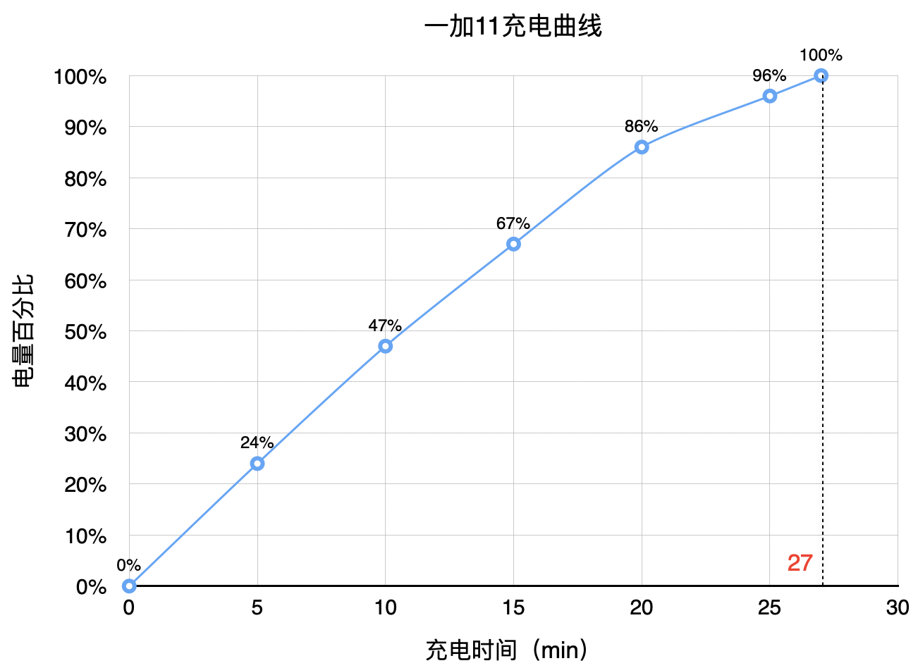 在充電上,一加11取消了無線充電的功能,但取而代之的搭載了長壽版100W有線快充,0-100%充電僅需要27分鐘。在5000mAh的超大電池以及快充的組合之下,一加11早已不再是早年間“續航焦慮”需要隨時補充電量的機型。