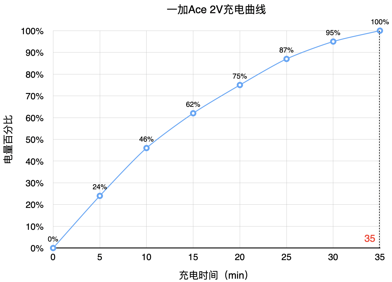 在充電方面,一加Ace 2V支持長壽版80W超級閃充,實測使用官方原裝充電器為手機充電,0-100%總耗時為35分鐘。