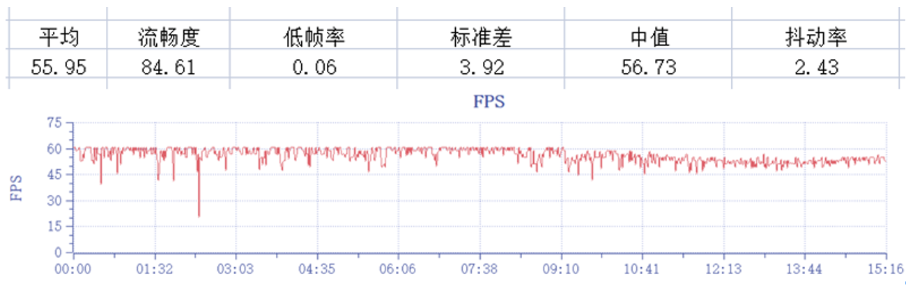 在游戲測試環節,我們選擇了負載更高的《原神》進行測試,先在手機設置中開啟“高性能”模式,再在游戲中心開啟“電競模式”,再在游戲畫質設置中,首先將圖像質量設置為“極高”,并手動將最大幀率設置為“60幀”。測試路線為須彌城跑圖。在15分鐘的測試中,一加Ace 2V能夠保持平均幀率在55.95幀,畫面并未出現明顯的幀率波動。