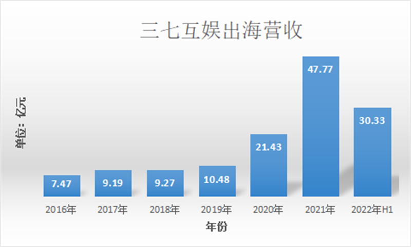 最近三年,三七互娛在海外市場的營收迎來新一輪暴增。財報顯示,2021年,三七互娛海外游戲業(yè)務(wù)收入47.77億元,較上年同期增長122.94%。到2022年年中,境外收入去到30.33億元,同比增長48.33%。出海收入已經(jīng)是支撐三七互娛每年業(yè)績增長的基石。