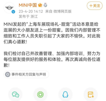 為此寶馬mini于4月20日和4月21日連發兩篇道歉信,20日的道歉信稱會加強內部管理培訓,但輿論仍在發酵。21日又發表一篇道歉信稱領到冰激凌的外籍人士系公司員工,并不是只給外國人。對這兩篇道歉信有超過14萬條評論,網友熱評“AI都比你會寫”可以明顯的看出大家對寶馬的道歉信并不買賬。