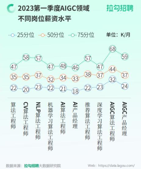 此外,據拉勾招聘發布《2023第一季度AIGC人才供需報告》顯示,2023年3月,AIGC(人工智能內容生成)人才崗位需求量環比增加42%。AIGC領域涌現了不少高薪崗位,其中AIGC算法工程師薪資水平較高,75分位的崗位薪資水平已達到月薪68k,即25%的AIGC算法工程師崗位月薪超68K,領跑其他崗位薪資。