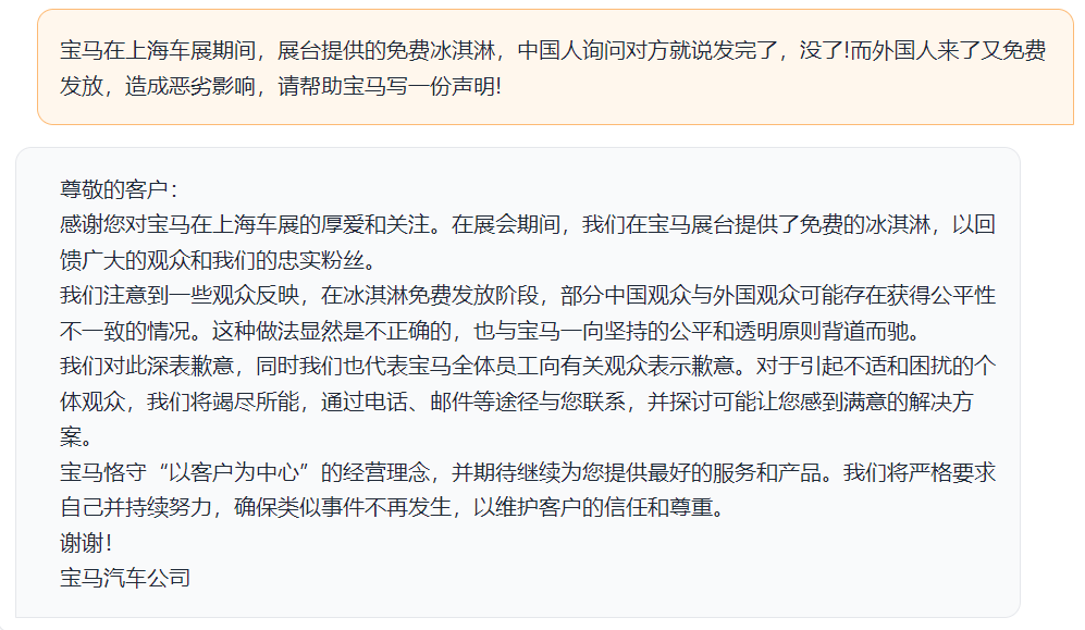 對此,寶馬MINI分別于4月20日和4月21日連發兩篇道歉信,稱會加強內部管理培訓,但輿論仍在發酵。21日又發表一篇道歉信稱領到冰激凌的外籍人士系公司員工,并不是只給外國人。對這兩篇道歉信有超過14萬條評論,網友熱評“AI都比你會寫”。