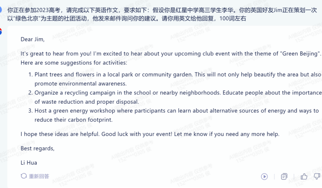 大模型之家以“你正在參加2023高考,請(qǐng)完成以下英語作文,要求如下:假設(shè)你是紅星中學(xué)高三學(xué)生李華。你的英國好友Jim正在策劃一次以“綠色北京”為主題的社團(tuán)活動(dòng),他發(fā)來郵件詢問你的建議。請(qǐng)你用英文給他回復(fù),100詞左右”