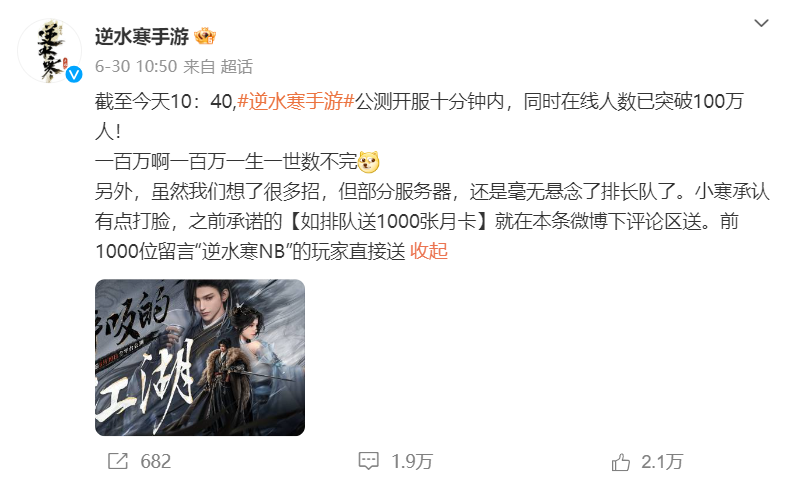 這樣一款不缺話題標簽的MMORPG,上線僅10分鐘,游戲同時在線人數便突破百萬,4500萬預約玩家把全部服務器擠到“熔斷”。不僅如此,《逆水寒》手游把市面上能想到的好成績,拿了一個“大滿貫”。