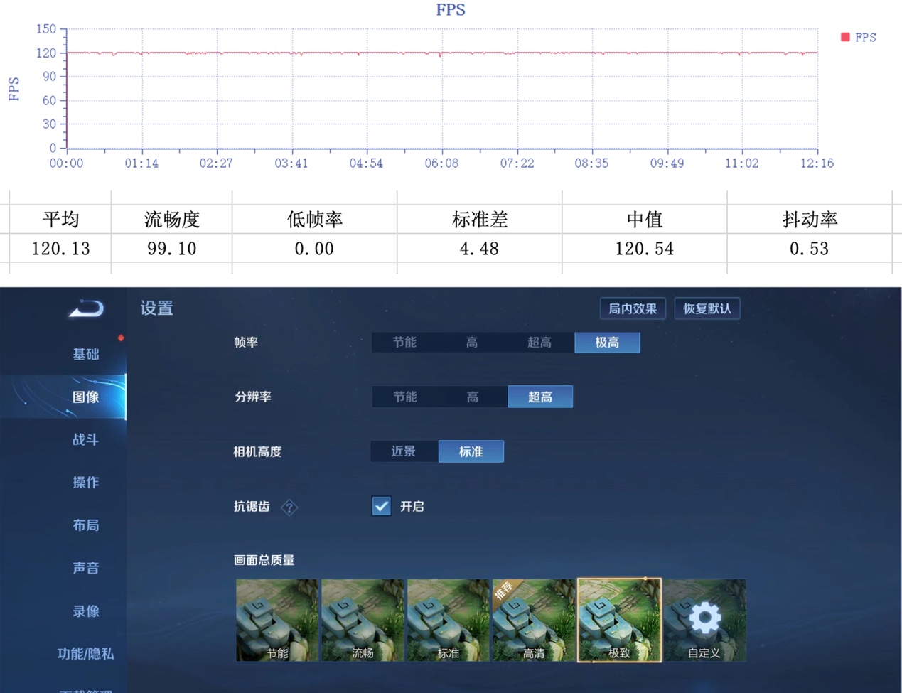 在《王者榮耀》的測試過程中,開啟游戲極高幀率以及極致畫質,游戲全程可以保持在120FPS穩定流暢的運行。可見,對于這類旗艦性能的機型而言,《王者榮耀》的性能壓力確實不夠大了。