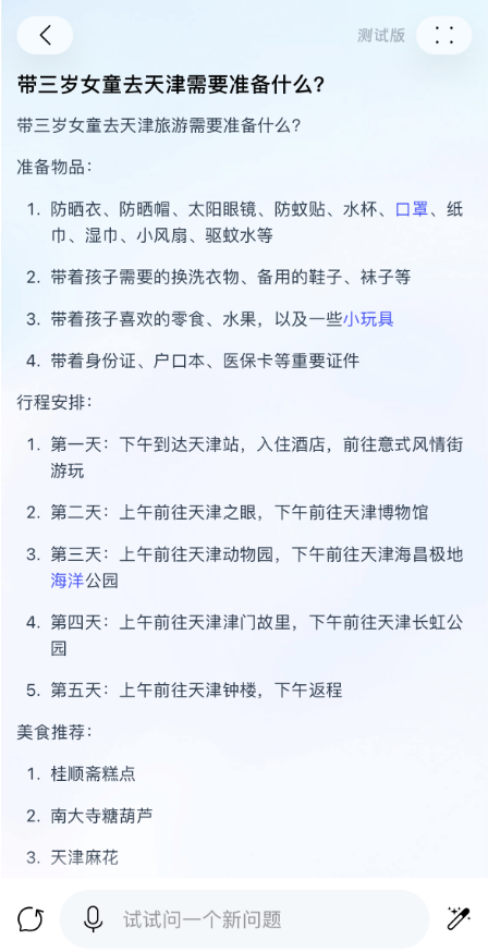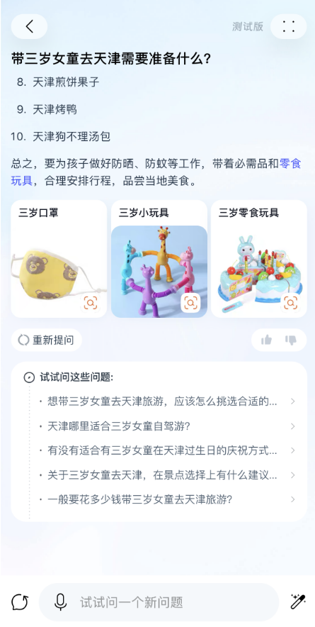 常見(jiàn)的問(wèn)答之外,大模型之家又向“旅行策劃人”模塊發(fā)起了“沖擊”。雖然淘寶問(wèn)問(wèn)以最快速度回答了“帶三歲女童去天津需要準(zhǔn)備什么”的問(wèn)題,并給出了流程上相對(duì)完整的“游玩攻略”及“美食推薦”,但與現(xiàn)下的“旅游平臺(tái)”相比,其在攻略的完整性(如交通方式),語(yǔ)言的措辭上,甚至是推薦景點(diǎn)的公開(kāi)信息(如票價(jià))上都十分欠缺。同時(shí),在大模型之家對(duì)首輪回答進(jìn)行追問(wèn),存疑之時(shí),淘寶問(wèn)問(wèn)并不能及時(shí)給出“答案”,甚至存在“答非所問(wèn)”的情況。