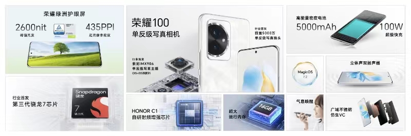 榮耀100搭載榮耀綠洲護眼屏,通過硬件級低藍光認證,搭配3840Hz超高頻PWM零風險調光、類自然光護眼與助眠顯示技術,全天候呵護用眼健康。影像方面,榮耀100首發索尼IMX906單反級寫真主攝、112°超廣角微距鏡頭、前置5000萬像素單反級寫真鏡頭,為用戶提供強大的影像體驗。性能方面,首次搭載第三代驍龍7芯片和自研射頻增強芯片C1,時刻滿分在線。搭配5000mAh大電池以及100W超級快充,為用戶帶來持久續航的產品體驗。
