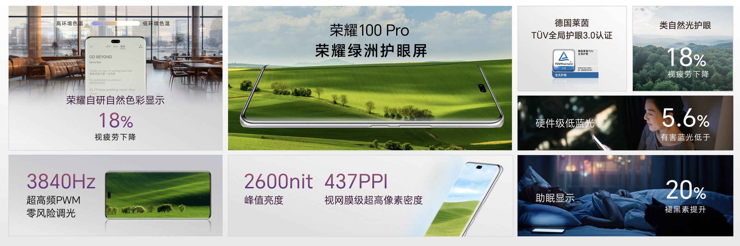 榮耀100 Pro支持行業最高2600nit峰值亮度,搭配超動態臻彩顯示,為用戶呈現明亮清晰、沉浸鮮活的屏幕效果。創新的榮耀綠洲護眼屏通過自然光級全天護眼技術,預防用戶視力疲勞,包括自研自然色彩顯示、3840Hz超高頻PWM調光、類自然光護眼、助眠顯示和硬件級低藍光等護眼技術,全面打造顯示擬真自然光,通過德國萊茵TüV全局護眼3.0認證,達到全天護眼級別。