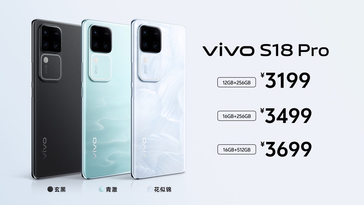 vivo S18系列有花似錦、青澈、玄黑三種配色。其中,vivo S18 8GB+256GB版售價2299元,12GB+256GB版售價2599元,12+512GB版售價2799元,16GB+512GB版售價2999元;vivo S18 Pro 12GB+256GB版售價3199元,16GB+256GB版售價3499元,16GB+512GB版售價3699元。