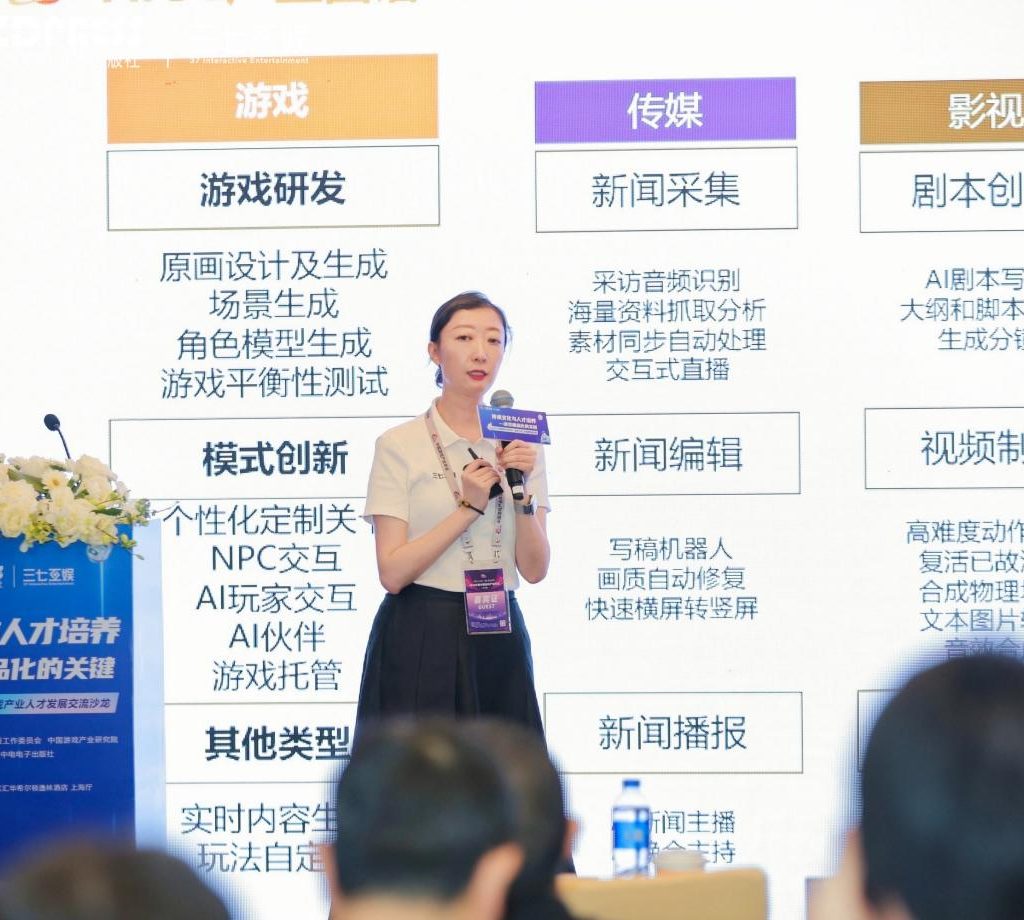 三七互娛集團(tuán)副總裁、CHO羅娟女士做了主題為《AIGC時(shí)代,游戲行業(yè)的人才如何擁抱變革》的演講,從AIGC發(fā)展歷程到實(shí)踐應(yīng)用、人才趨勢(shì)洞察、人才變革和人才新要求,為游戲行業(yè)人才詳細(xì)剖析了現(xiàn)狀并提出了諸多行動(dòng)建議。