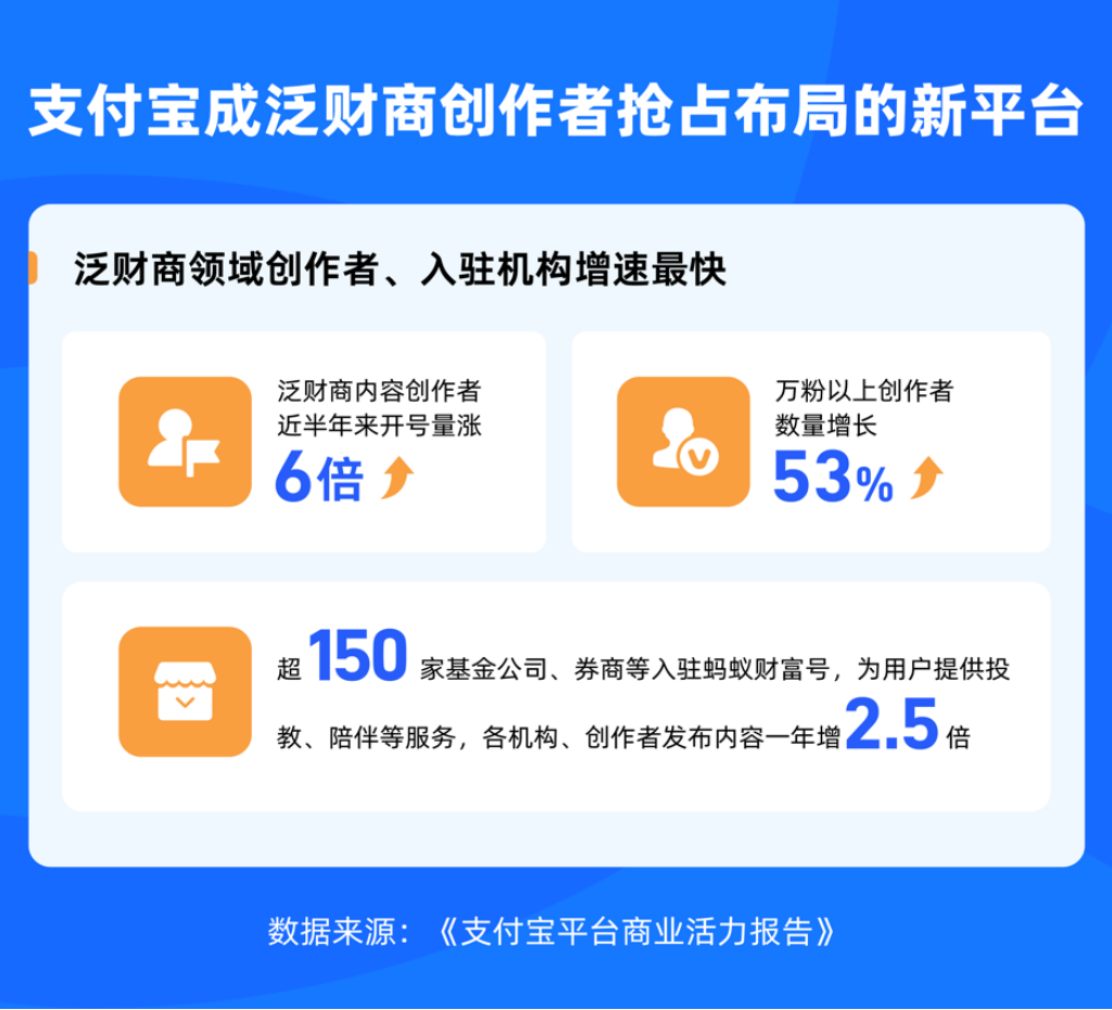 支付寶已成為泛財商創作者搶先布局的新平臺。報告顯示,以短視頻、直播為代表的支付寶內容生態規模持續增長,過去一年,支付寶平臺上MCN數量翻倍,直播間數量增長14倍。其中,泛財商成為增速最快的內容垂類,創作者開號量漲了6倍,超150家基金公司、券商入駐,提供投教、陪伴等服務,形成“內容+服務”的差異化特性。