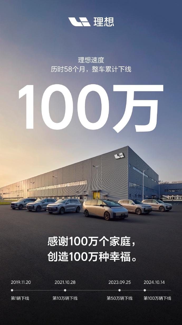 速途車酷10月15日消息(報道:李憶姁)歷時58個月,理想汽車迎來了其發展歷程中的一個重要里程碑——第100萬輛整車正式下線。這一事件不僅標志著理想汽車自身實力的顯著提升,也象征著中國智能電動汽車行業的快速發展和成熟。
