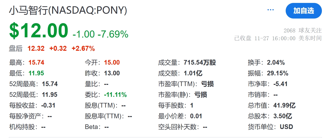 上市首日,小馬智行股價一度拉升至15.74美元/ADS,漲幅超21%,此后股價一路下跌,發行首日收盤價為12.00美元/ADS,跌破發行價,收跌7.69%。當前小馬智行總市值為41.99億美元。