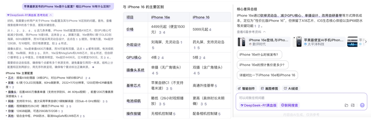 接下來,讓我們開啟百度AI搜索的聯(lián)網(wǎng)功能,來提問一些更有挑戰(zhàn)性的問題。第一個(gè)問題,我們向百度AI提問:“蘋果最新發(fā)布的iPhone 16e是什么配置?相比iPhone 16有什么區(qū)別?”