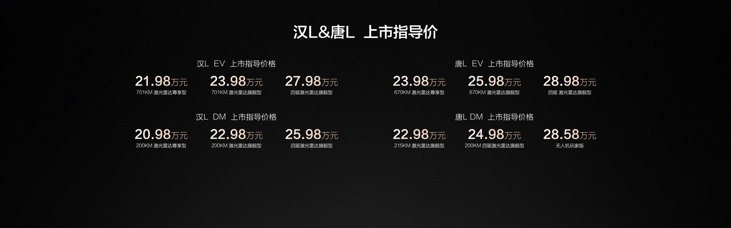 速途網4月10日消息(報道:李楠)近日,比亞迪劃時代旗艦SUV唐L正式上市,共推出唐L DM、唐L EV兩大車系。新車長寬高分別為5040*1996*1760mm,軸距2950mm,是標準的C+級SUV。其中,唐L DM坐擁215KM激光雷達旗艦型、200KM四驅激光雷達旗艦型、無人機玩家版;唐L EV坐擁670KM激光雷達尊享型、670KM激光雷達旗艦型、四驅激光雷達旗艦型。新車提供4種外觀顏色及2種內飾配色,售價為22.98萬~28.98萬元。