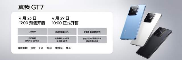 真我GT7現(xiàn)已正式開啟預(yù)售,4月29日10點全渠道現(xiàn)貨開售,價保618。購機可享至高12期免息分期,換新補貼最高800元,老用戶以舊換新至高享200元額外補貼。