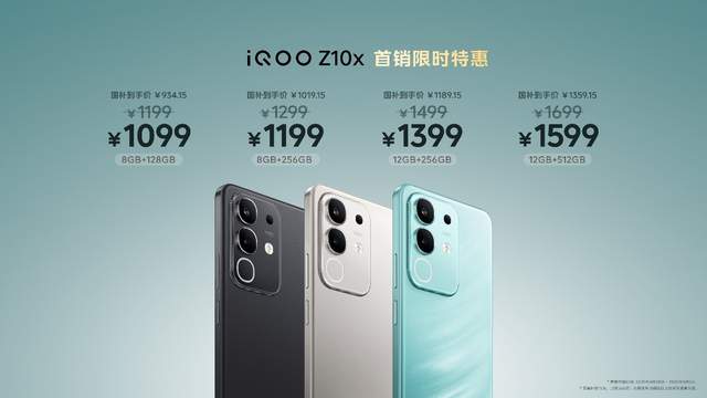 iQOO Z10 Turbo 系列共有“燃”、“沙漠色”、“云海白”和“星穹黑”四種配色可選,兩款產品都提供 12GB+256GB、12GB+512GB、16GB+256GB 和 16GB+512GB 四種存儲組合可選,iQOO Z10 Turbo Pro 到手價 1999 元起,國補到手價 1699.15 元起、iQOO Z10 Turbo 到手價 1799 元起,國補到手價 1529.15 元起。iQOO Z10x 共有“風羽青”、“月巖鈦”和“星穹黑”三種配色可選,提供 8GB+128GB、8GB+256GB、12GB+256GB 和 12GB+512GB 四種存儲組合可選,到手價 1199 元起,首銷限時特惠全版本減 100 元,到手價 1099 元起,國補到手價934.15 元起。