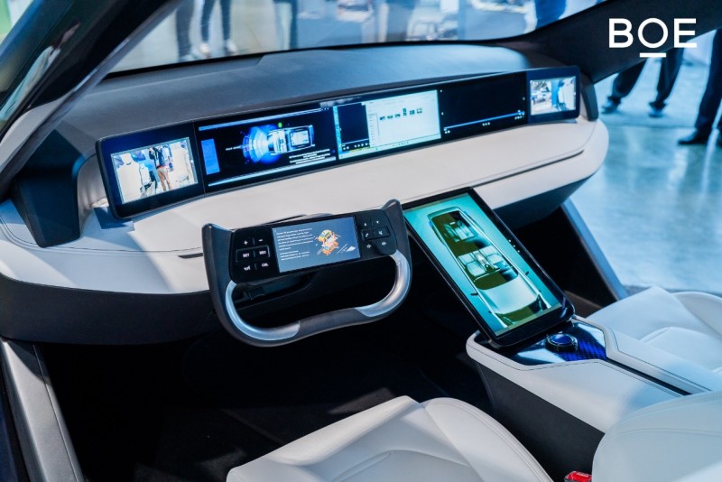 在f-OLED展區(qū)內(nèi),BOE(京東方)展示了其基于多形態(tài)解決方案的多款首發(fā)新品,例如BOE(京東方)全球首發(fā)的OLED智慧駕艙,共搭載8種OLED顯示產(chǎn)品,其中全球首發(fā)的55英寸超廣角OLED透明天窗擁有46%超高透過率,讓科技與自然無縫交接;前排連屏和L型屏幕在提升視覺效果和科技感的同時,也為信息展示和觸控操作提供了便利;同時,智能方向盤采用全球首款集成大面積超聲波指紋傳感器的OLED屏幕,融合了超聲波屏下指紋識別、生物監(jiān)測和觸覺反饋,為駕駛員的安全、個性化駕駛增添助力。此外,BOE(京東方)還展示了全球首款搭載TADF+Tandem+COE技術(shù)的 OLED智能終端顯示解決方案,通過采用Tandem器件,即使在高亮環(huán)境光下仍然能夠高度還原畫質(zhì),成功突破了傳統(tǒng)顯示技術(shù)在色域、功耗和壽命方面的限制;配合TADF(延遲熱激活熒光技術(shù))的加持,可實現(xiàn)BT2020色域高達97.5%,峰值亮度高達2500nit。