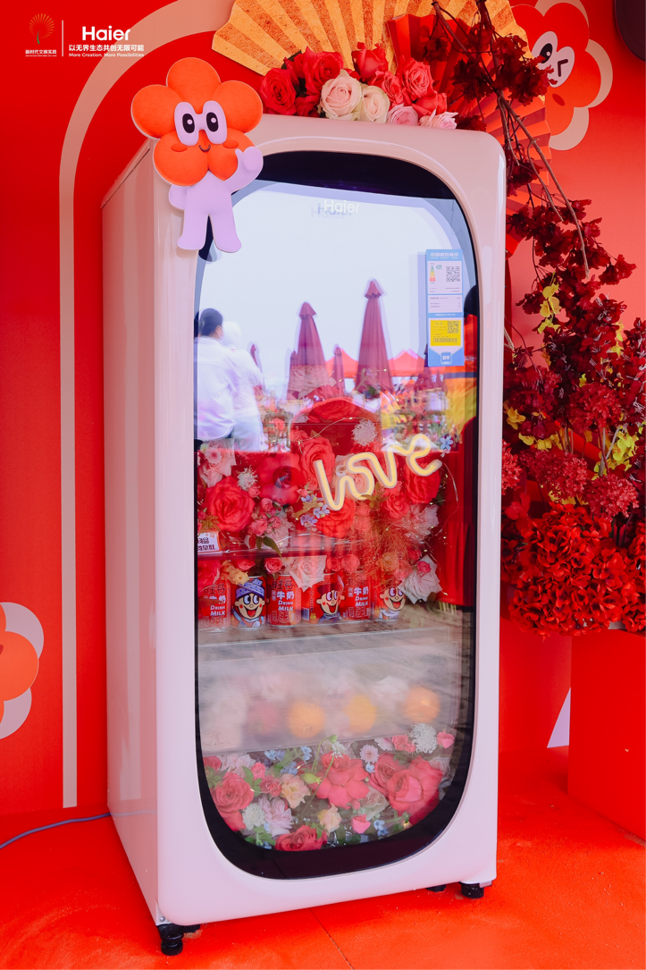 與單一產品不同,小紅花元氣冰吧在婚禮現場承擔多重角色:不僅是儲鮮工具,還是帶有情緒附加值的“社交中心”——既能存放雞尾酒、冰沙滿足年輕人的“微醺自由”,又能化身美妝冰箱存放面膜精華,甚至成為拍照打卡的背景墻。