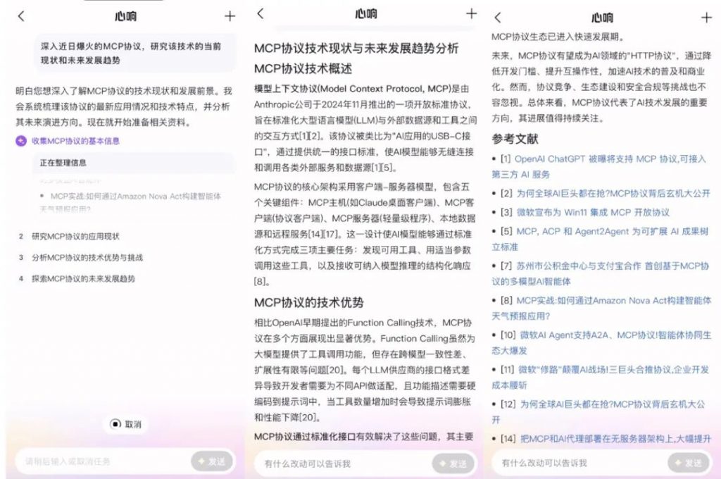 在真實任務中,心響展現出強大的信息組織與內容生成能力。為了考驗心響App對于任務分解能力與執行能力,我們首先提出一個復雜問題,讓它來處理一個關于“MCP協議現狀和未來發展趨勢”的任務。